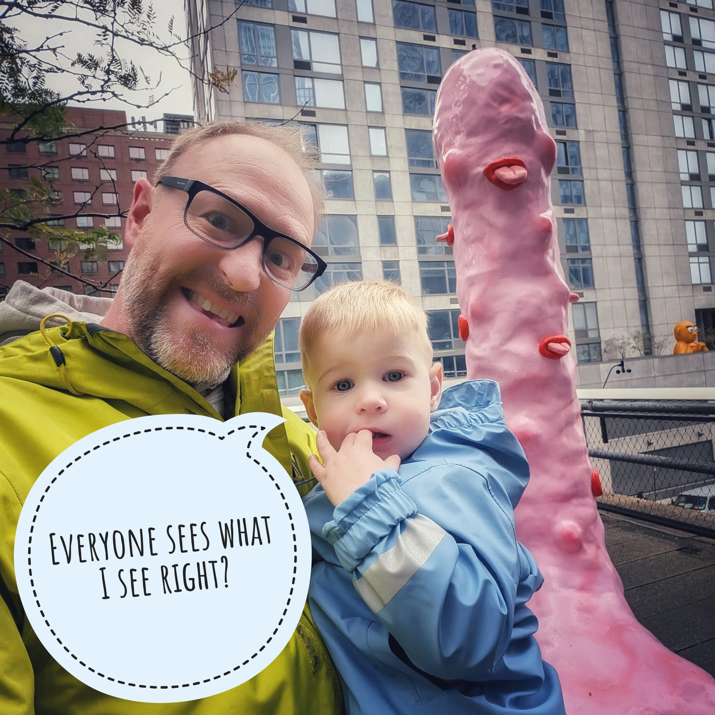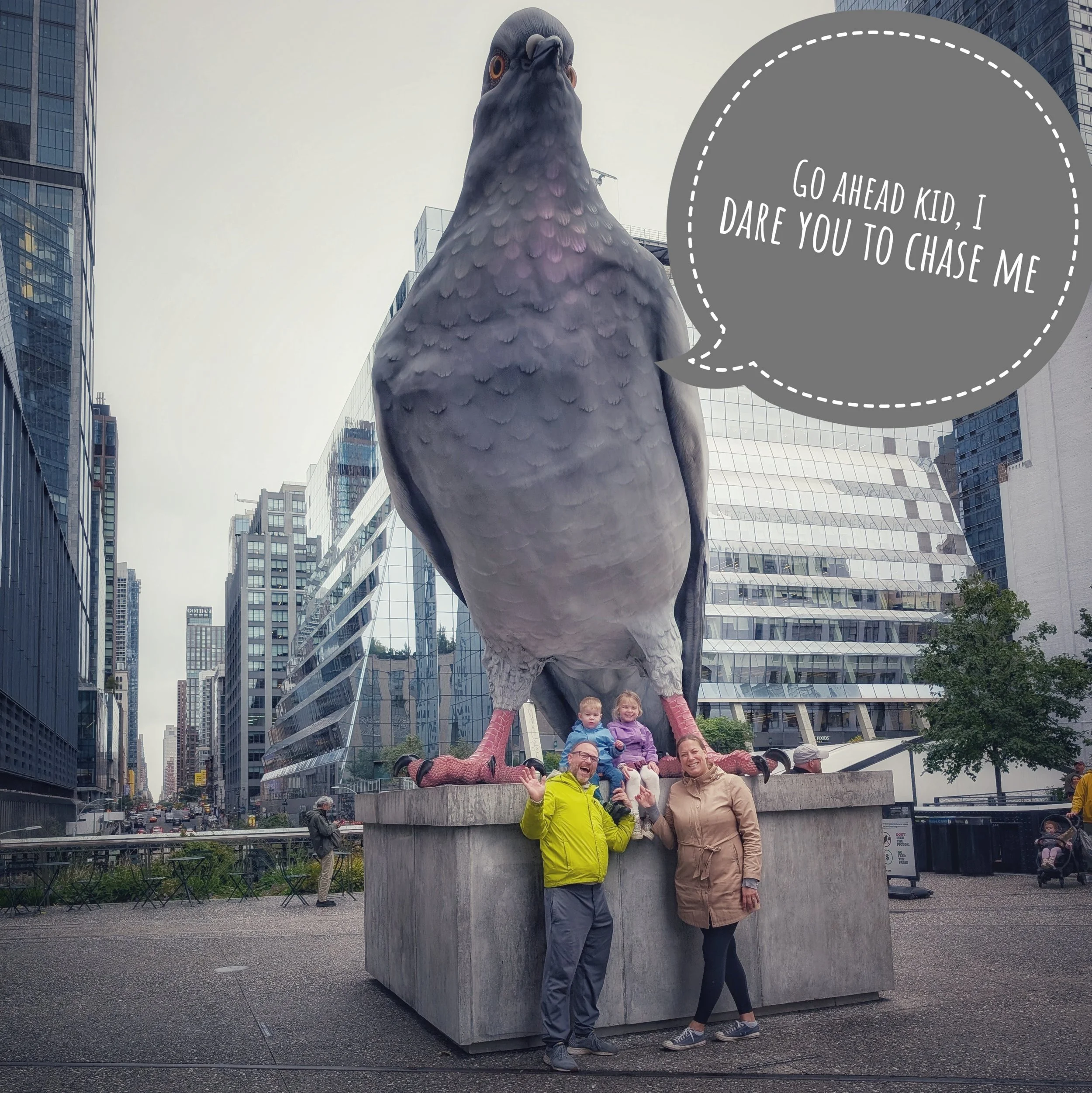 Another feature along the High Line is a gigantic pigeon. Wesley, brave in all things except large birds, takes one look and decides today is not the day. No chasing. No eye contact. Just quiet respect and a wide berth.