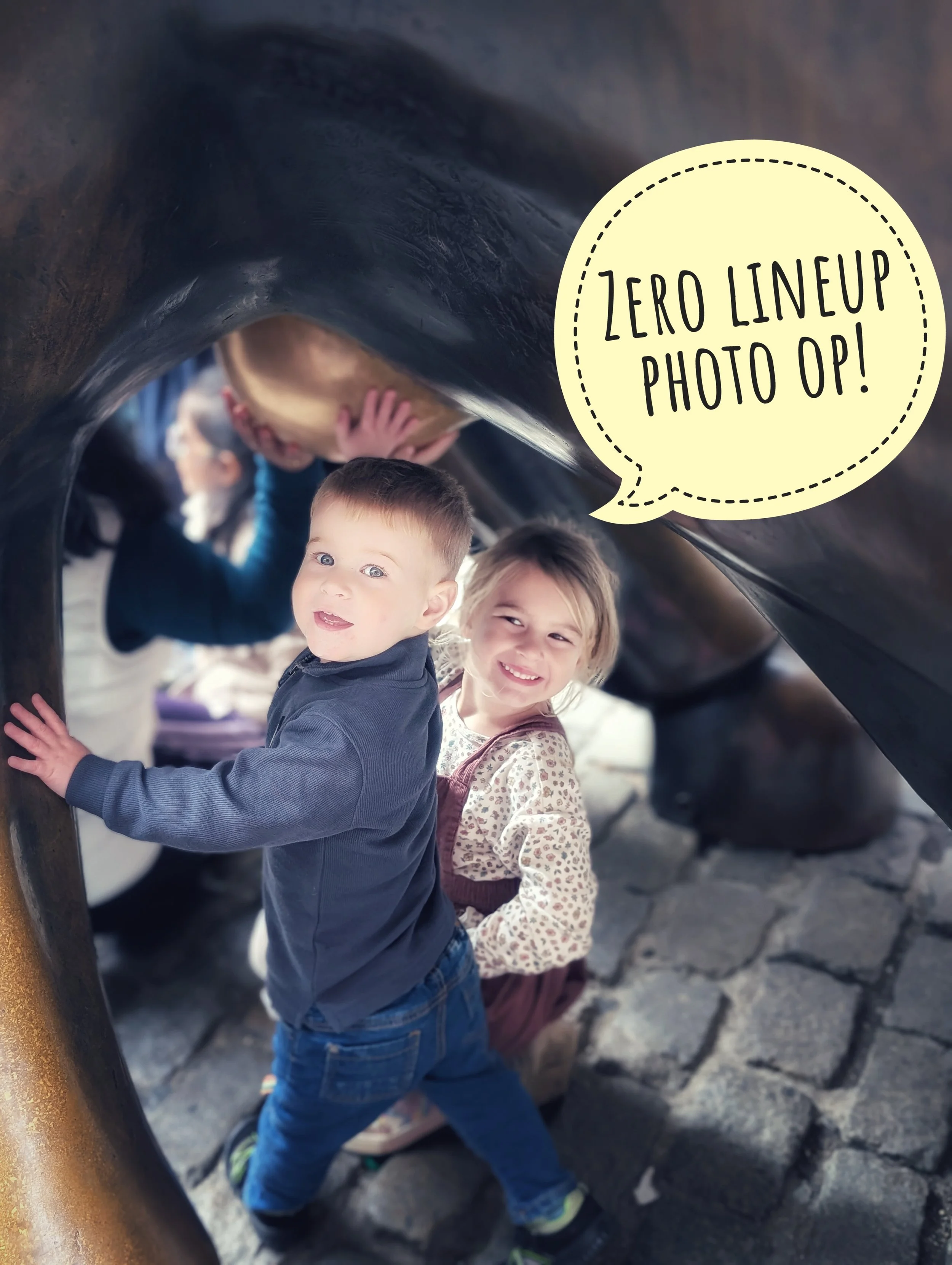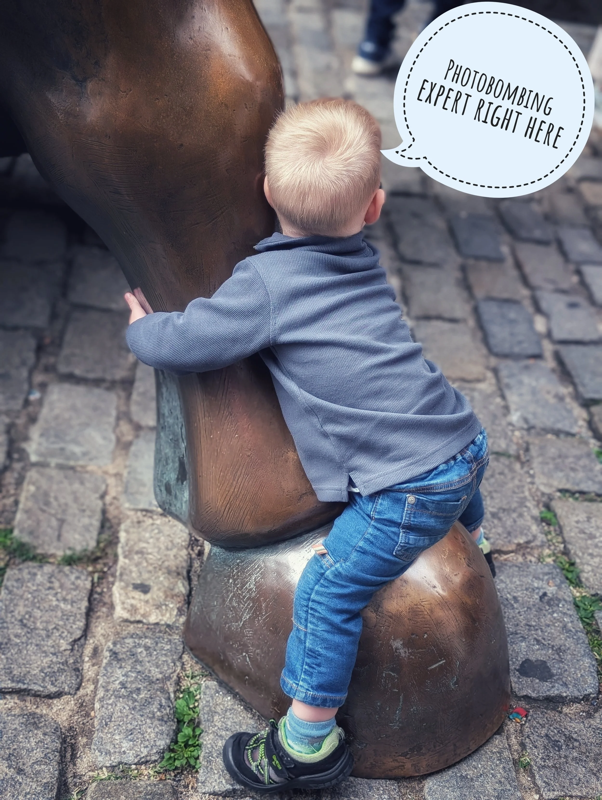 The kids immediately attack the bull like it’s a playground. They photobomb strangers. They tackle the legs. They crawl underneath. And yes… they touch the golden testicles.